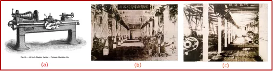 图11 (a) Putnam 公司生产的车床 (1860), (b) 江南制造局炮厂机器房 (宣统年间摄),(c) 江南制造局机器厂
